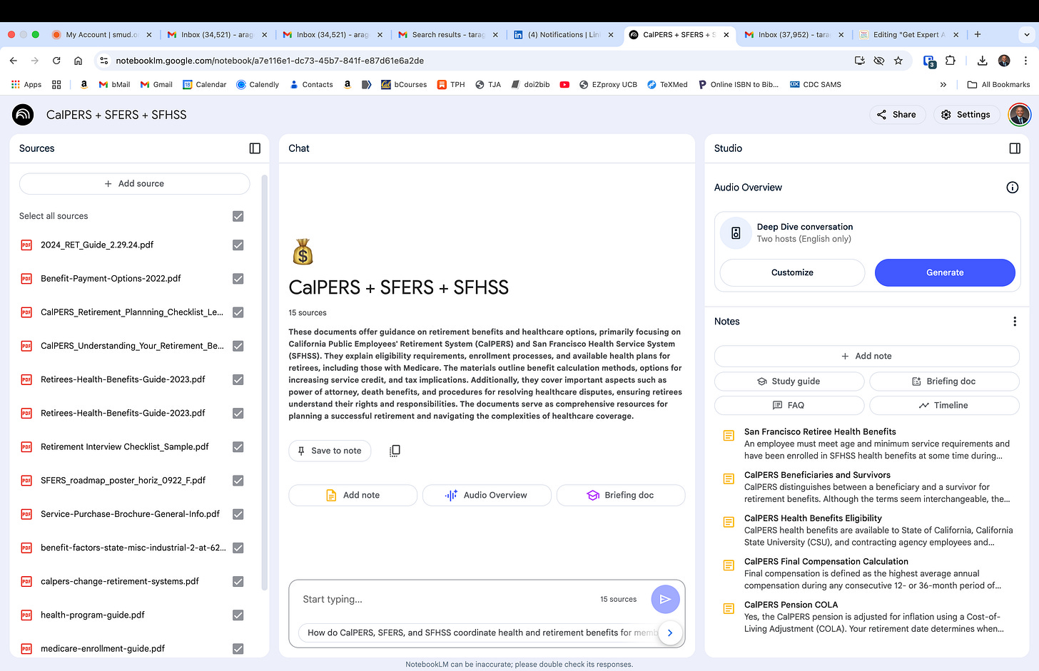 I uploaded to NotebookLM all the documents from the state and local retirement and health systems I belong to (Figure 2). On the left pane are the document sources I uploaded. NotebookLM studies the sources that are checked. At the bottom of the center pane I can enter queries or start with the suggested queries. The responses have links to the location in the source document. This is great for verifying the response and for exploring the topic further in the source document. If I like the answer I can save it as a note. The saved notes are listed at the bottom of the right pane.
