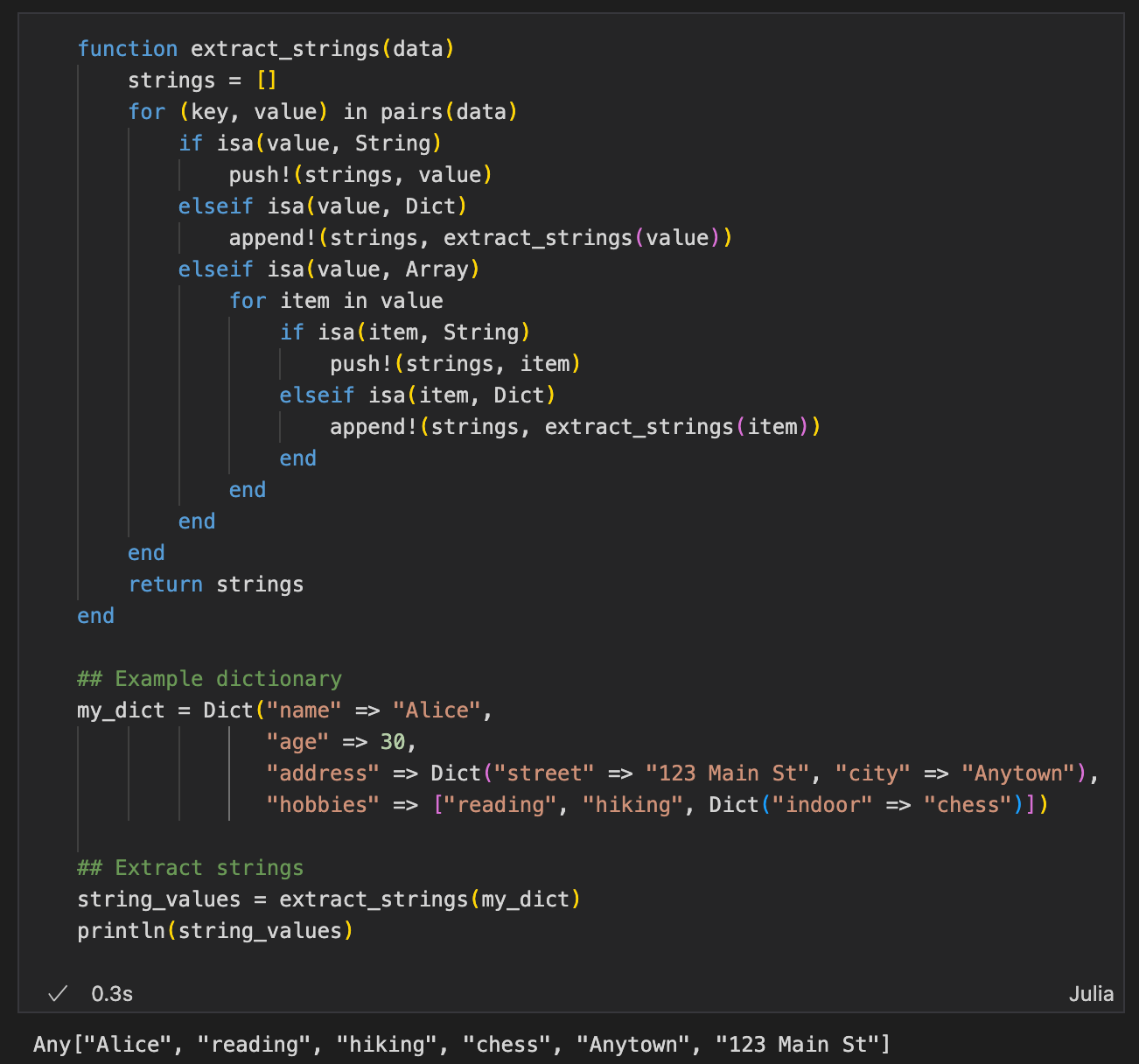 Here is the Julia code created by NotebookLM demonstrating a recursive function extracting string data from a dictionary. I tested the function then adapted to my use case.