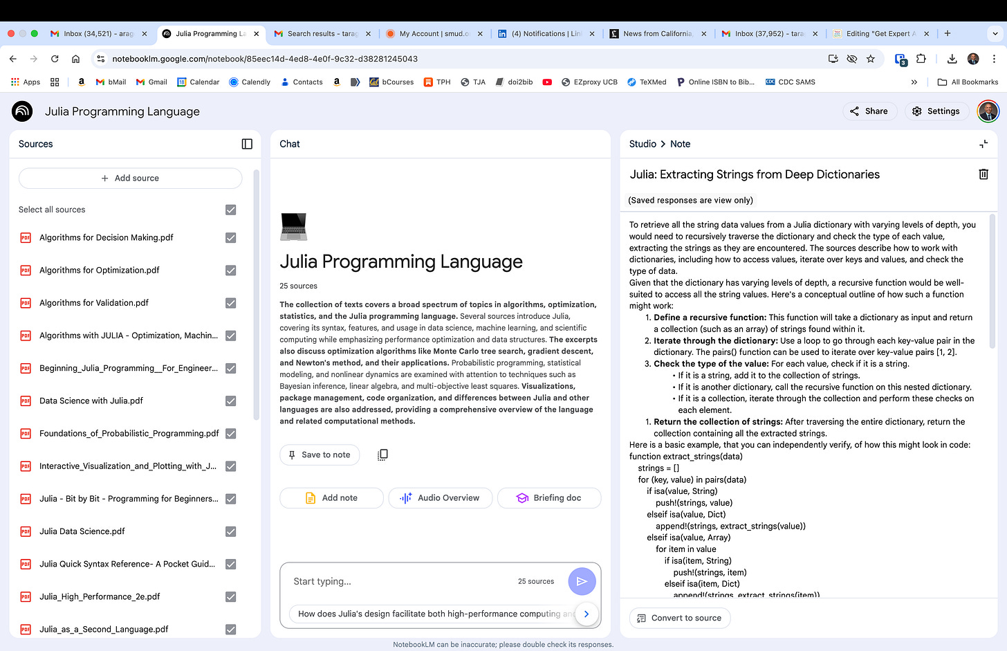 NotebookLM is a game changer for me. It has dramatically accelerated my learning. For example, for scientific computing I use the Julia language (Figure 3). I was writing Julia code to query and retrieve PubMed articles and their abstracts. I converted the PubMed XML output to a Julia dictionary which contains key-value pairs that are contained in a branching tree structure. I described my problem to NotebookLM and it responded with a very precise answer! It recommended creating a recursive function.