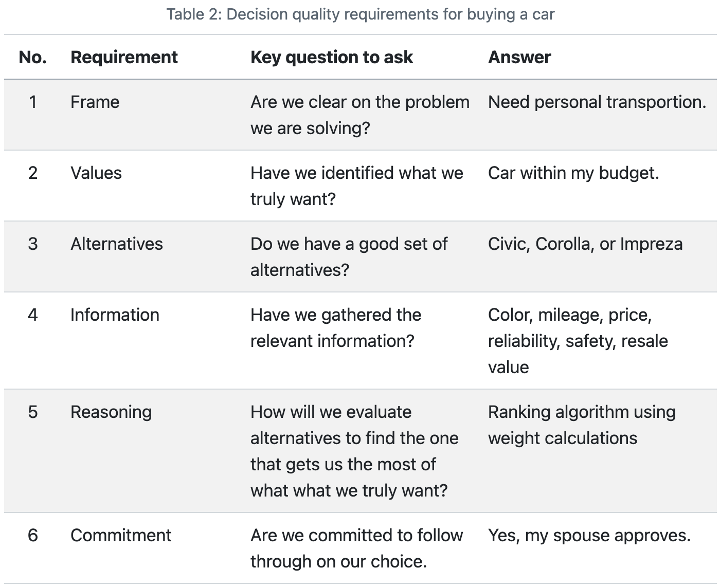 Now, suppose we wish to buy a car and our choices are a Honda Civic, and Subaru Impreza, or Toyota Corolla. We have data on the following attributes: safety (S), mileage (M), reliability (R), color (C), price (P), and resale value (V). Table 2 summarizes the DQ requirements for buying our car.