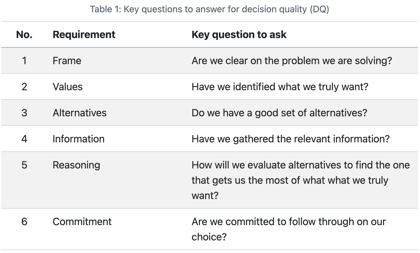 Human decision intelligence (HDI) is applying ethics, science, and technology to support team and individual decisions to solve problems, achieve objectives, and improve and innovate in the face of time constraints, uncertainty, and trade-offs. Think of human decision intelligence in the same way you might think about human emotional intelligence. A foundational component of HDI is decision quality — the six requirements of good decision making. At a minimum, a decision quality checklist (DQ) (Table 1) improves the quality of decisions at any stage of problem solving. A good decision is only as strong as its weakest link.