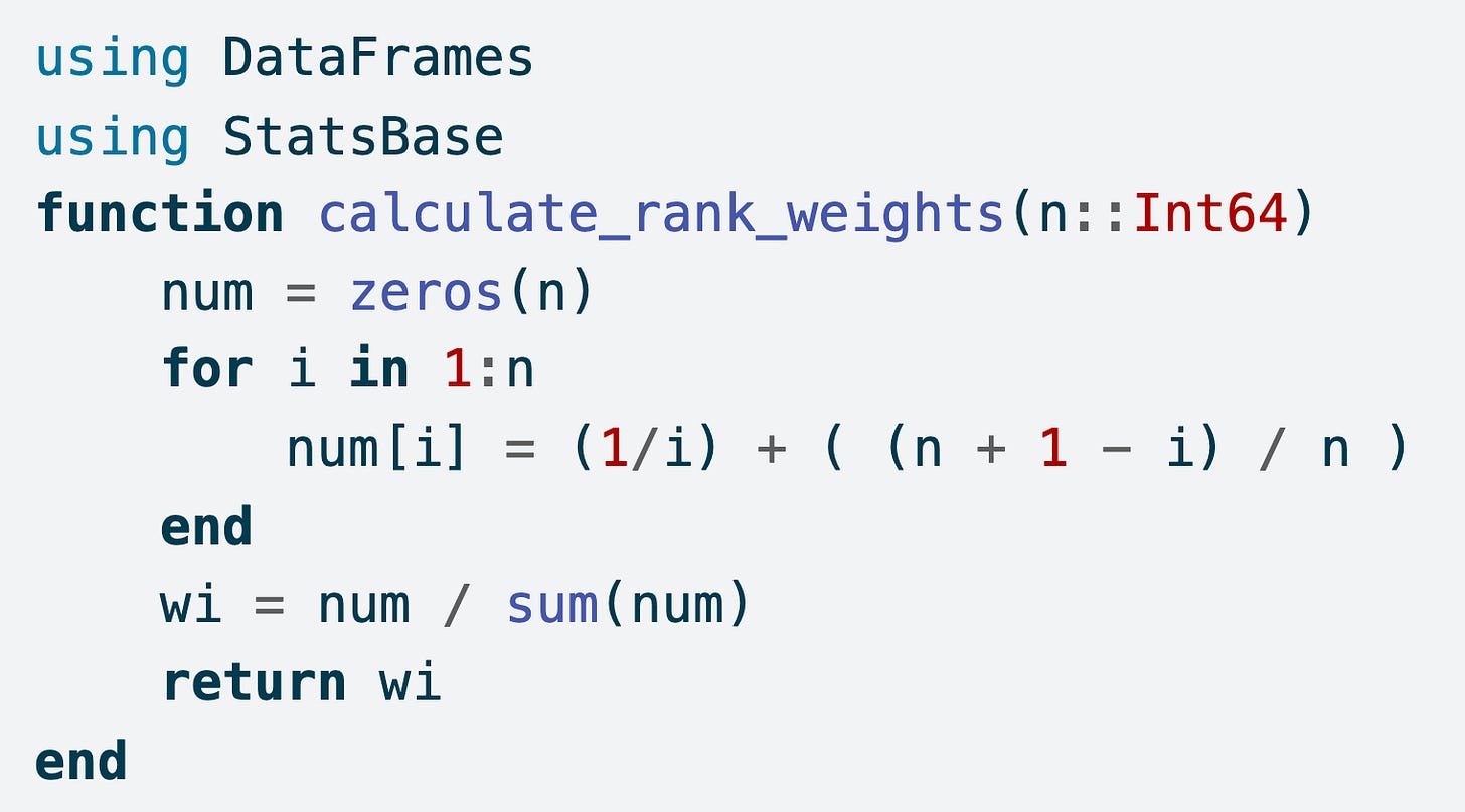 Use Julia to calculate the final criteria weights. We will use the split-apply-combine workflow that I introduced in a previous blog post and book review.4